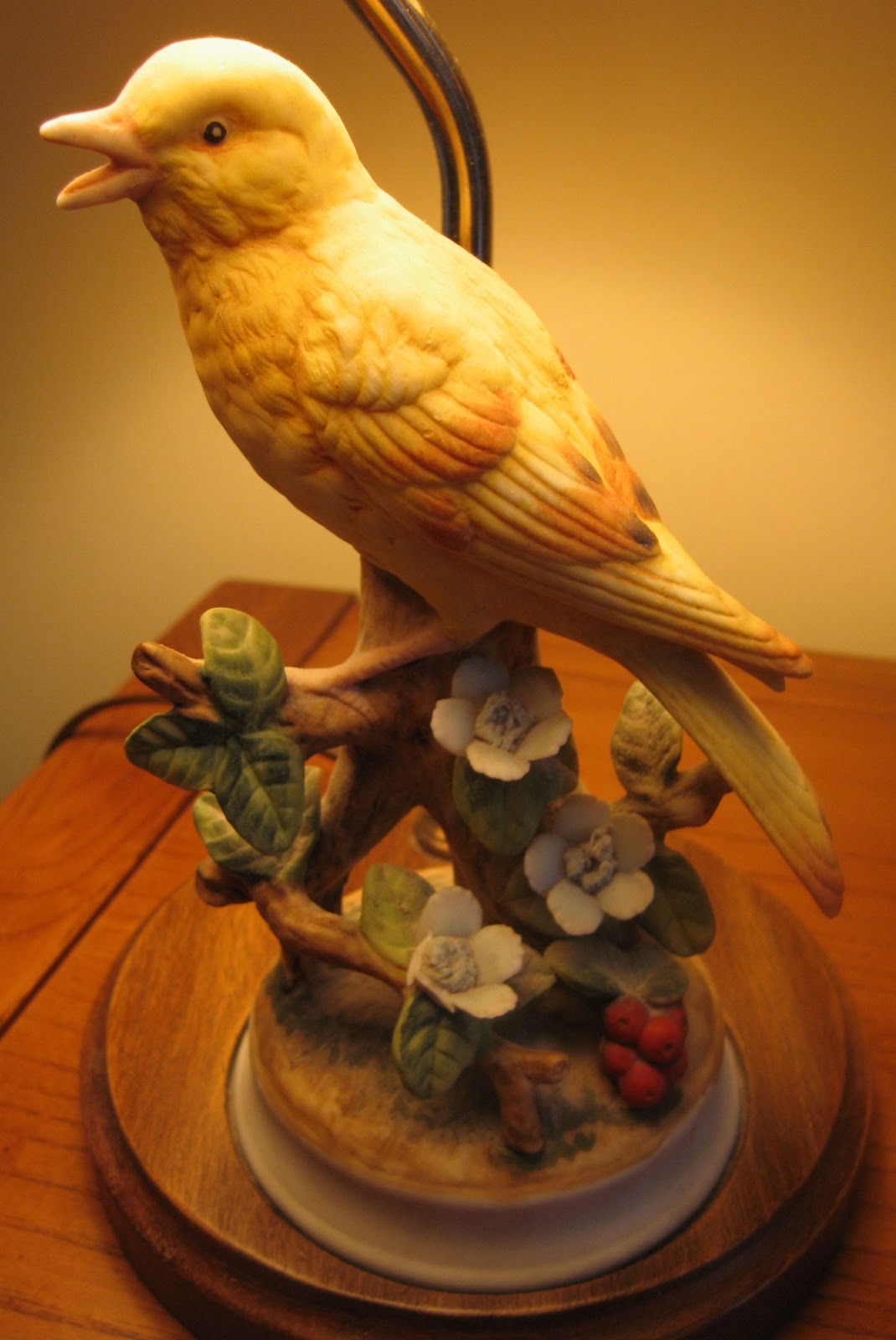 At the time we hadn't been married that long...it may have been our second married Christmas because I remember being in our second apartment (Countryside) in Palatine, Illinois. We will be married 37 years this May so these lamps are probably around 35 years old now. They have weathered the years gracefully...only two little chips on one of the flowers on the yellow canary bird. But then I have a few "chips" too after all these years.